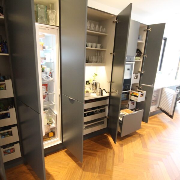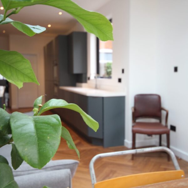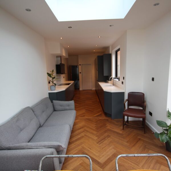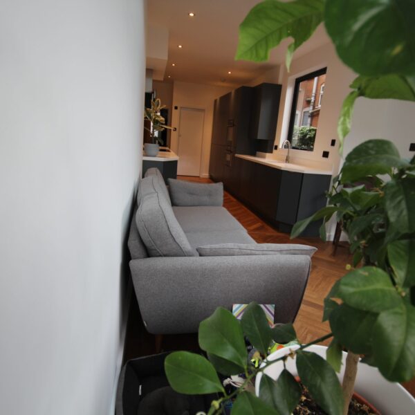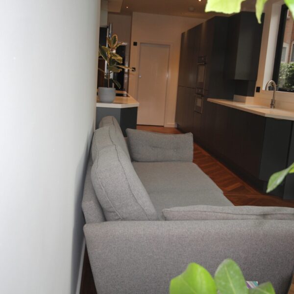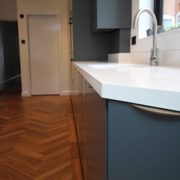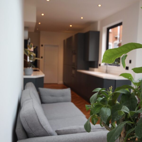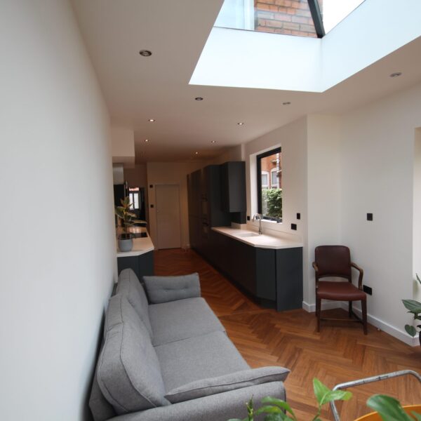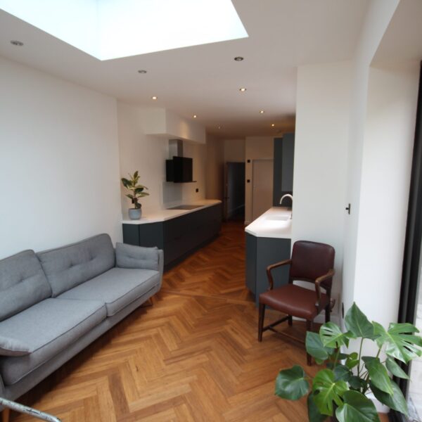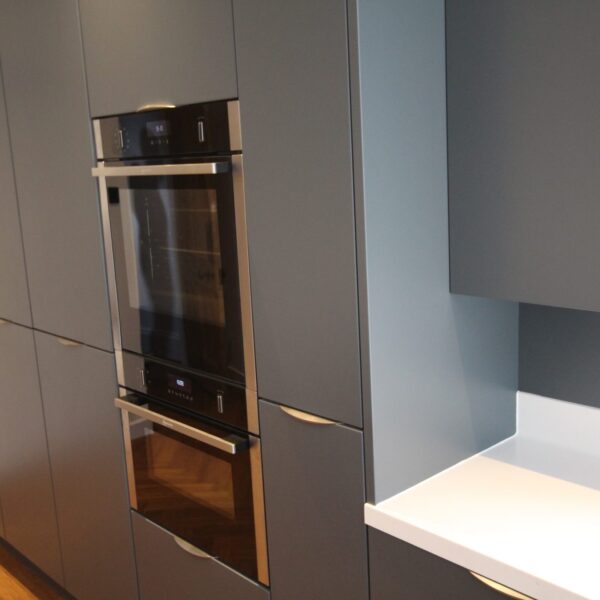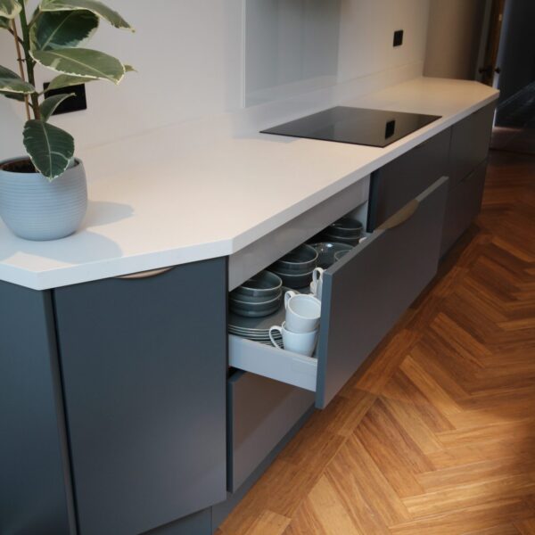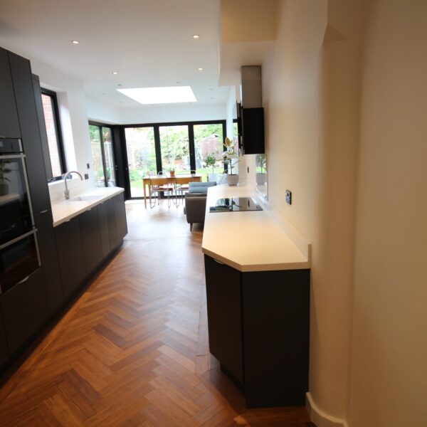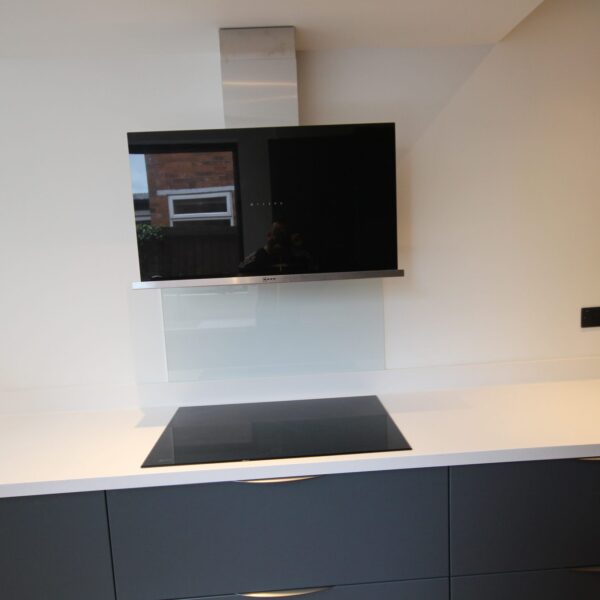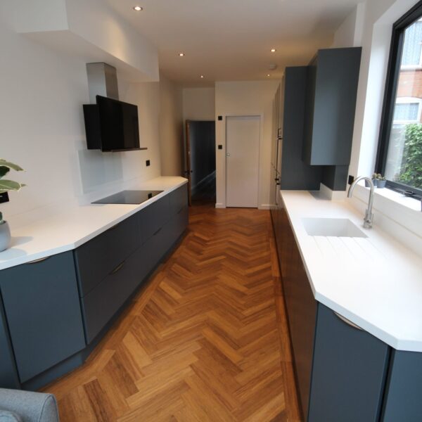 A sleek, modern, matt painted kitchen in Kings Heath; painted seal grey with medium edge bow handles. Our clients had a lovely town house; the kitchen had an unusable lean-to at the rear. There were also doors and windows in the wrong positions which made the kitchen difficult to use in a practical way. The lean-to was knocked down and replaced with an extension. This gave an open plan family area; with bi-fold doors overlooking their garden and a ceiling lantern filling the room with light.