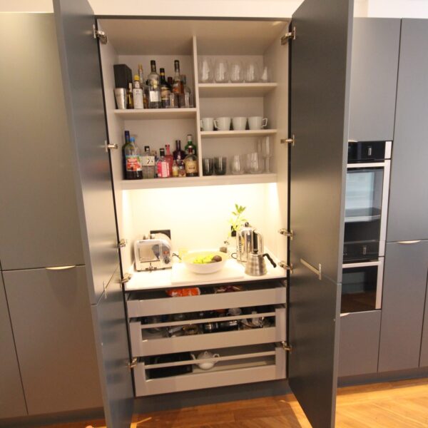 Therefore, we blocked up a window and door to the left hand side of the kitchen. This allowed us to have a large bank of units to house all of the appliances. Within this bank of units there were two space towers. We also included a pantry unit with extra hidden worktop space which would be used for making drinks and to house the toaster; this kept the rest of the worktop clutter free.