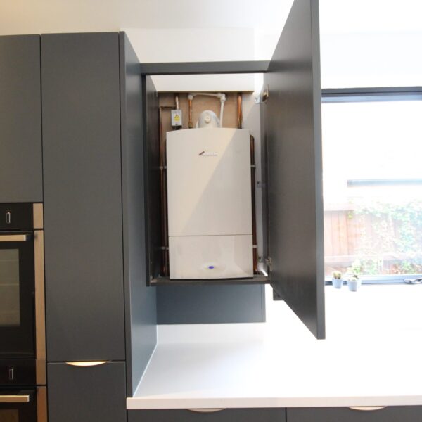 Toni contacted us following a recommendation from her builder who we had previously worked with. They didn’t want their galley kitchen to feel cramped but needed to house a boiler and include larder units, a tall fridge, built under freezer and two ovens.