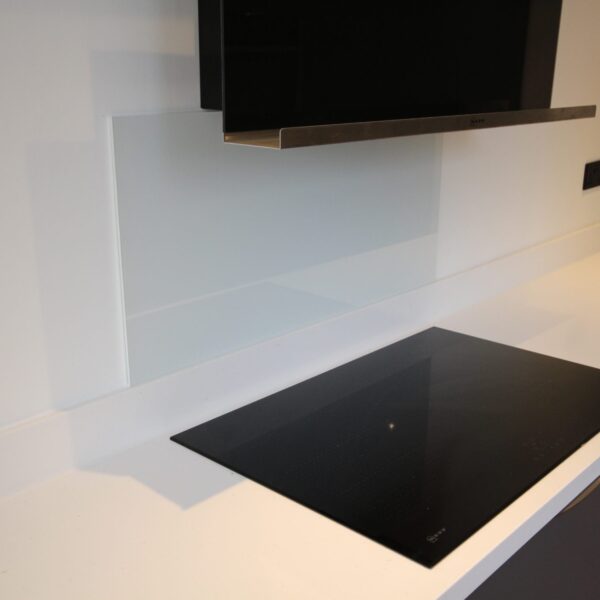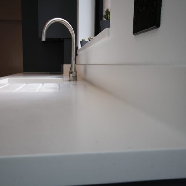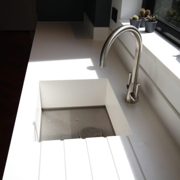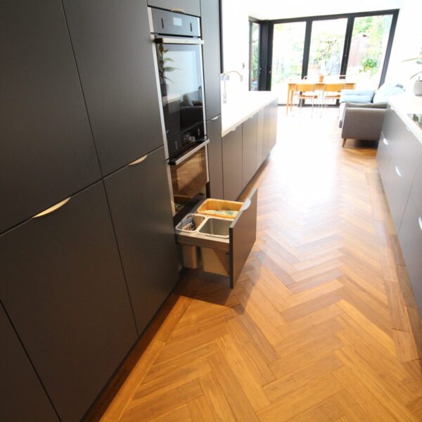 At the end of the bank of units was a Corian worktop with sink in front of the window. On the opposite side the hob was positioned centrally amongst a run of drawers. To help with the feeling of space the only thing that was put on this wall was a slim extractor; so that when you come into the room you’re looking straight through to the garden; giving a real feeling of space.