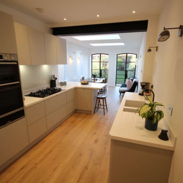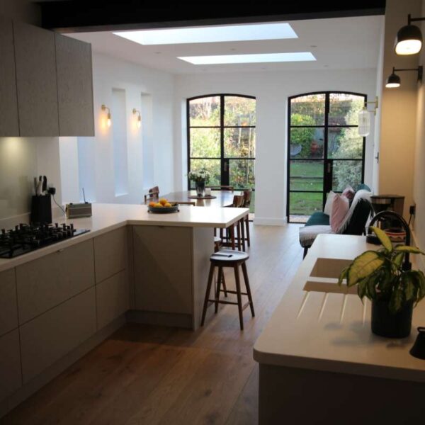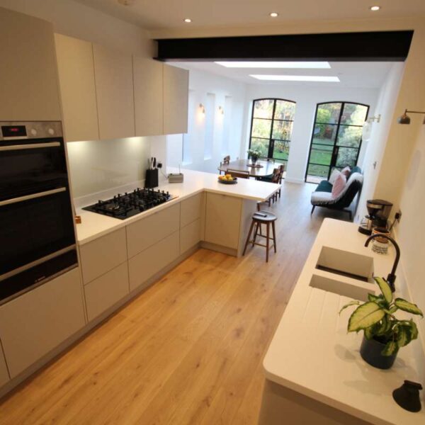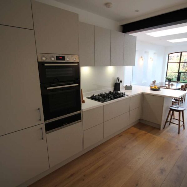 Our clients were looking for a modern kitchen; they didn’t really want a shaker kitchen but still wanted something with texture.  We suggested a painted wood veneer kitchen; on seeing the sample our clients immediately knew that this was what they were looking for.