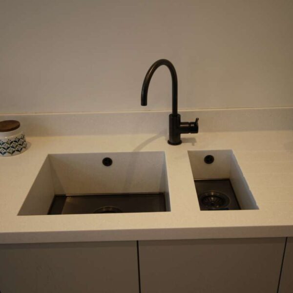 Corian Antarctica worktops with Corian axix sinks added to the sleek, fresh feel of the kitchen.  To optimize the smooth lines a Westin Cache extractor was used, with a white glass splash back.