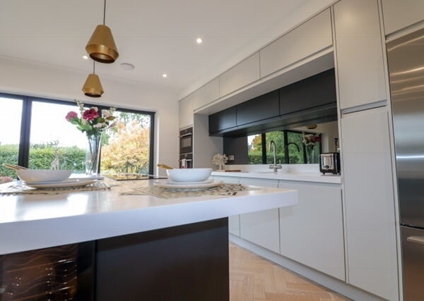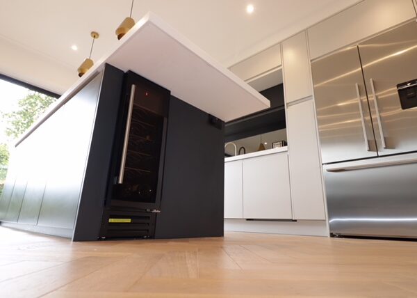 The back wall housed a NEFF slide and hide oven; combination microwave; warming drawer; a freestanding Fisher and Paykel fridge freezer; built-in dishwasher and integrated pull out bin. The fridge was framed by two larder units with pull out drawers; in a light grey super matte finish with a row of anthracite cupboards tying the two areas together. A grey mirrored splash back complemented the contemporary style.