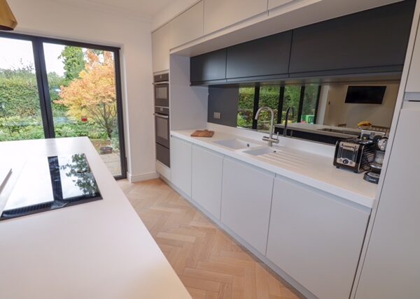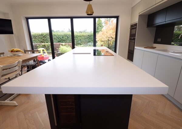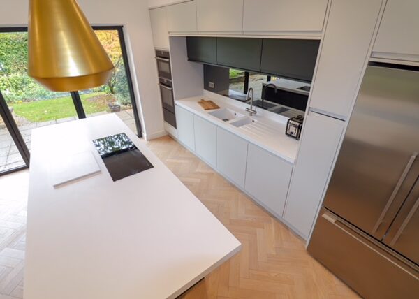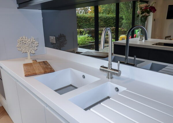 To complete the look they chose corian worktops with a coved up-stand in designer white; with an 1810 Axix sink with corian sides.