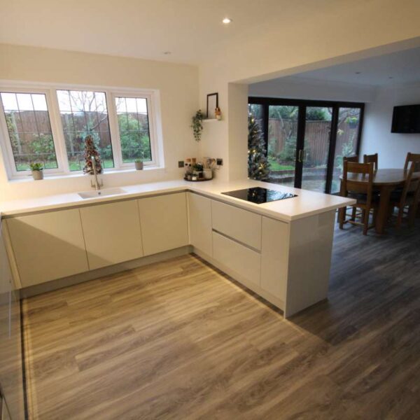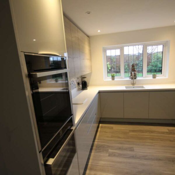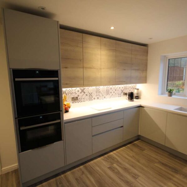 A beautiful open-plan gloss kitchen for clients in Halesowen. Our clients chose light grey gloss doors for the base units and tall housings. To add a different texture the wall units were Halifax Oak book matched doors.