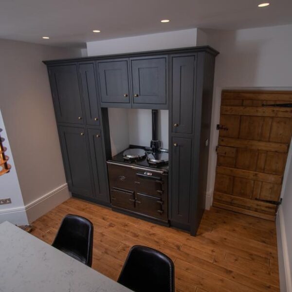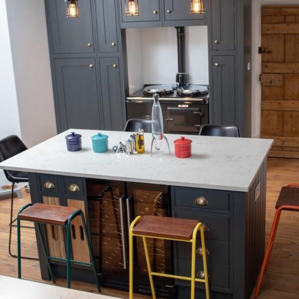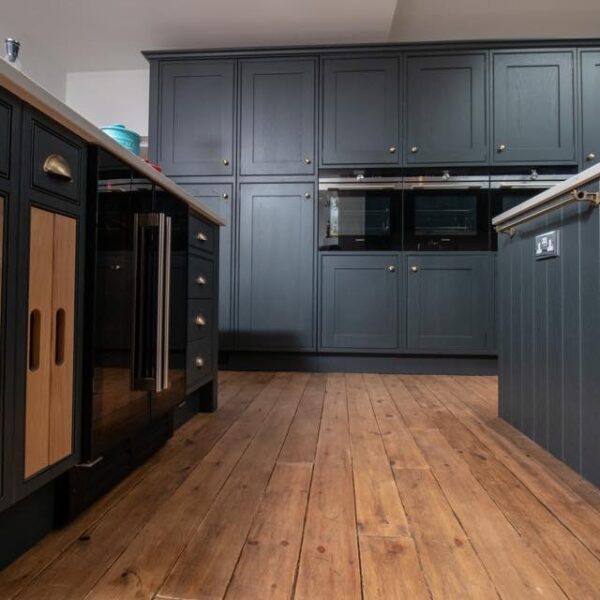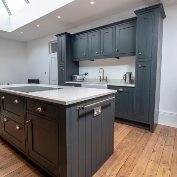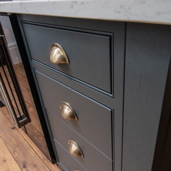 Following our meeting with Phil; explaining what we could do for him, he was very much on side. Phil visited the showroom and after looking at initial plans and costs; it became clear that we were the company for him. Our client wanted a painted solid oak in-frame kitchen with a contemporary feel. Phil chose doors in black/blue with a quartz marble effect worktop. In addition, antiqued brass handles, a re-commissioned antique brass tap and hanging rails completed the look. We got to work with his kitchen Design in Bridgnorth and we created something truly spectacular (as can be seen from the gallery).