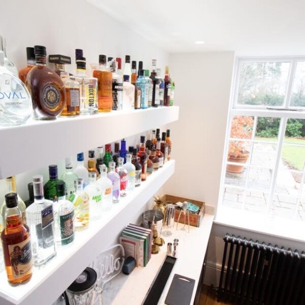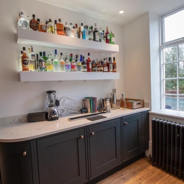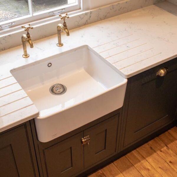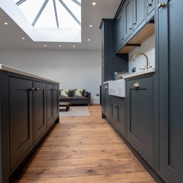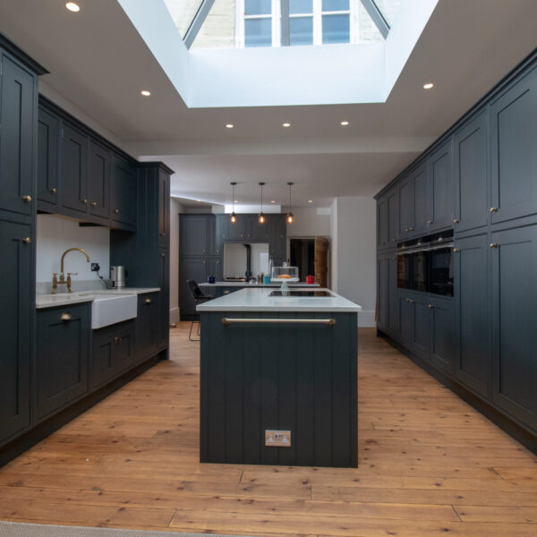 This bank also incorporated larder units with internal dovetail drawers. In front of this another island unit featuring a Siemens flex induction hob. This side of the island featured lots of drawer space, with cupboards on the other side facing the sink run. To balance the look of the sink run with the bank of units on the opposite wall we began and ended the run with 300mm wide larder units. A double Belfast sink with a beautiful antique brass tap positioned centrally with a dishwasher one side and a pull out bin the other, with wall units over the top helping to frame the sink. If you require Kitchen Design in Bridgnorth – please get in touch!