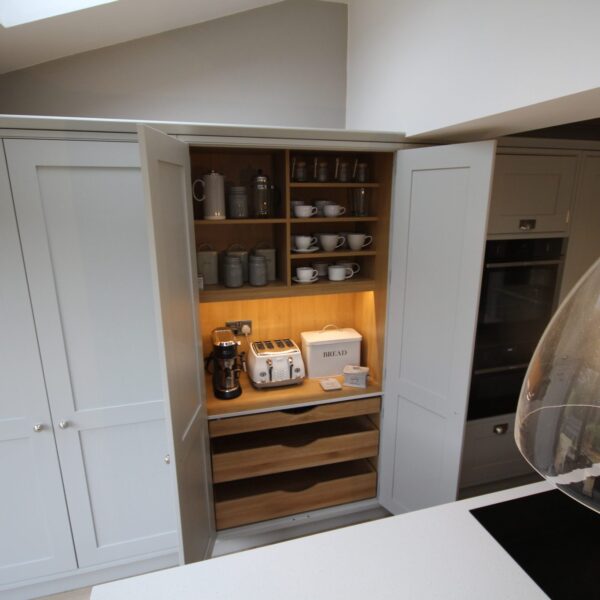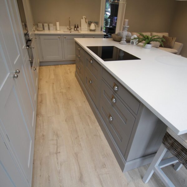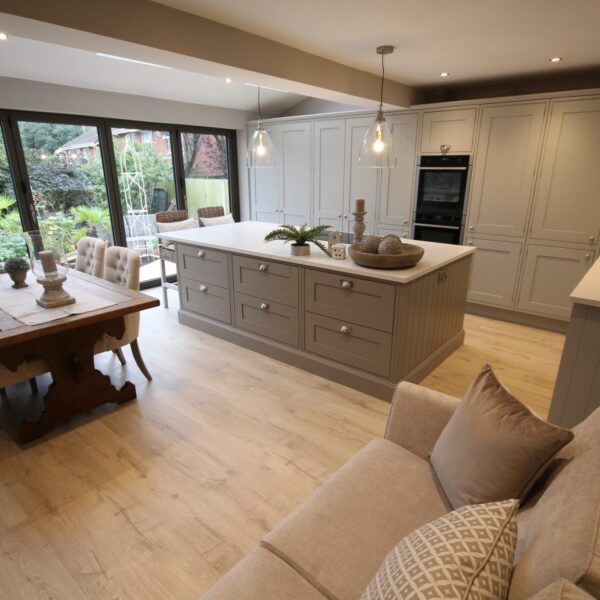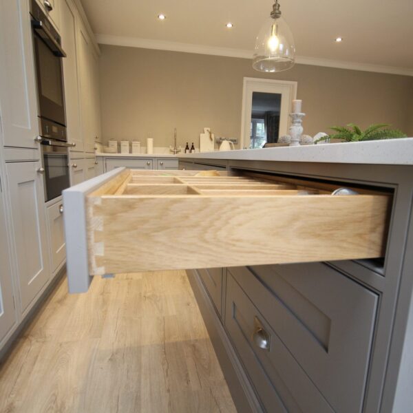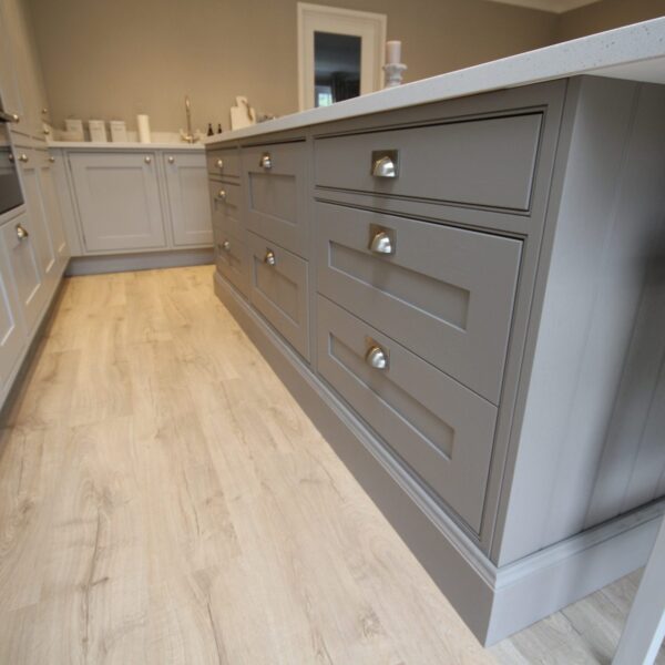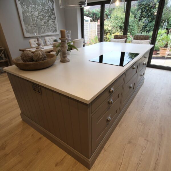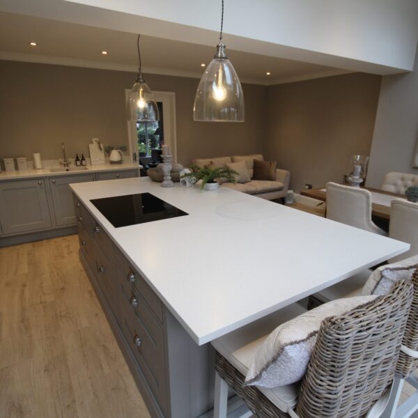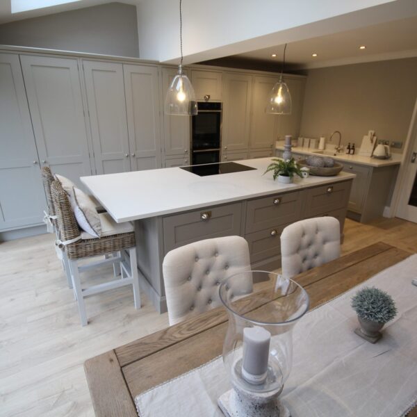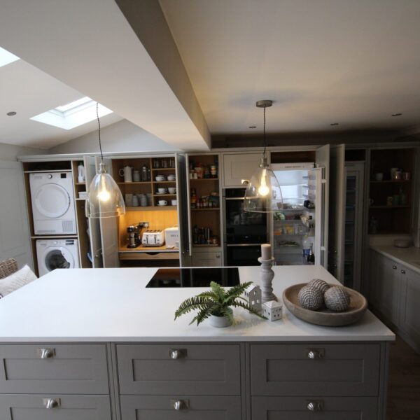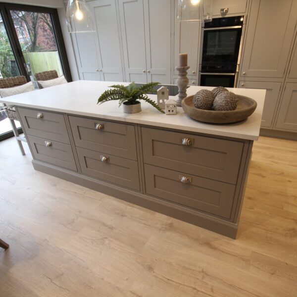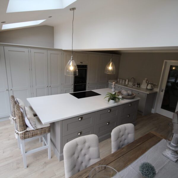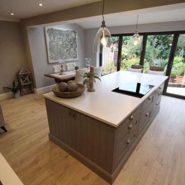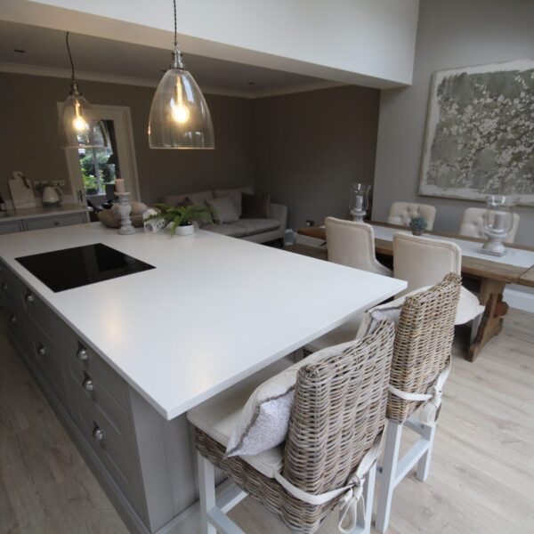 They were looking for an in-frame kitchen, and after visiting our showroom and seeing our beautiful in-frame display decided that they would like to incorporate a pantry into the design along with utility housing and plenty of storage. Above all; the focal point for the kitchen though was the large island made up with dovetail drawers and a profile plinth; featuring a breakfast bar and induction hob; completed with a Corian Aspen worktop.