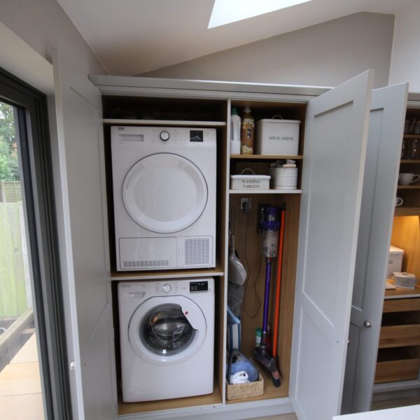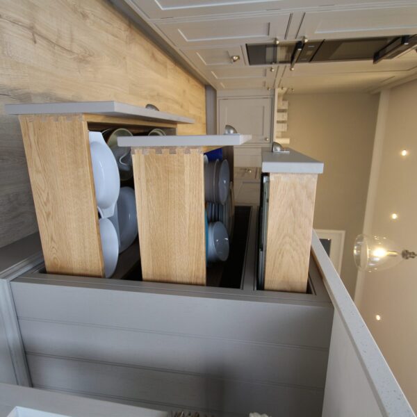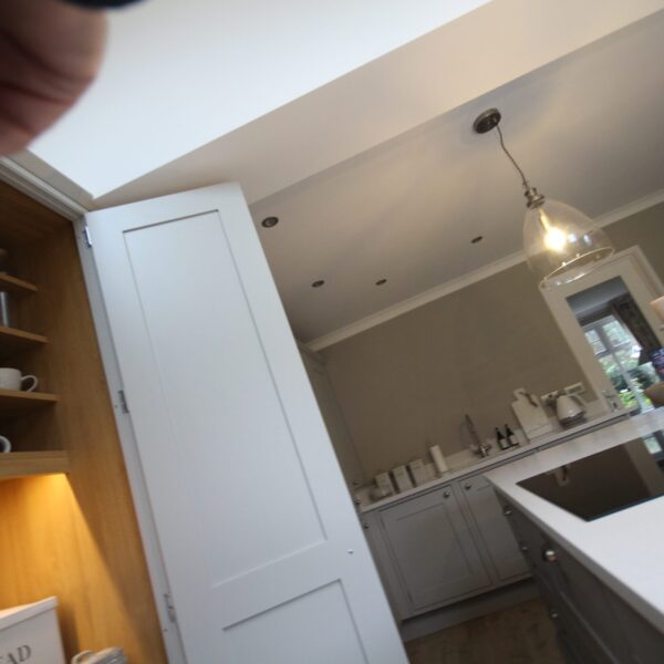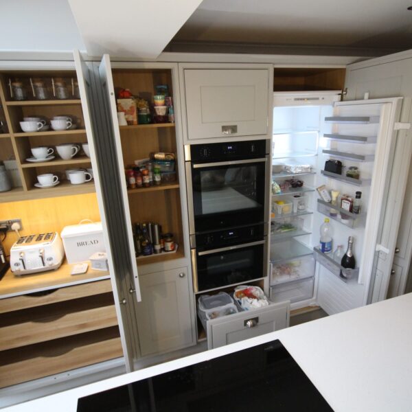 In addition, the amazing bank of units isn’t all it seems. Behind the stylish tall units was a utility cupboard, tall fridge and freezer and bespoke pantry with dovetail drawers housing tea and coffee making facilities.