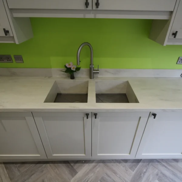 The heart of any kitchen lies in its sink and worktops: areas that bear the brunt of daily kitchen activities. Here, we chose a resilient Corian sink, which paired beautifully with the 38mm Corian Clam Shell worktop. Not only does this combination assure durability, but it imparts an unwavering elegance that is sure to stand the test of time.