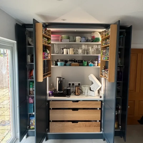 - Internal upgrades – Oak dovetail drawer boxes for strength and longevity, plus oak spice racks inside the pantry for order at a glance
