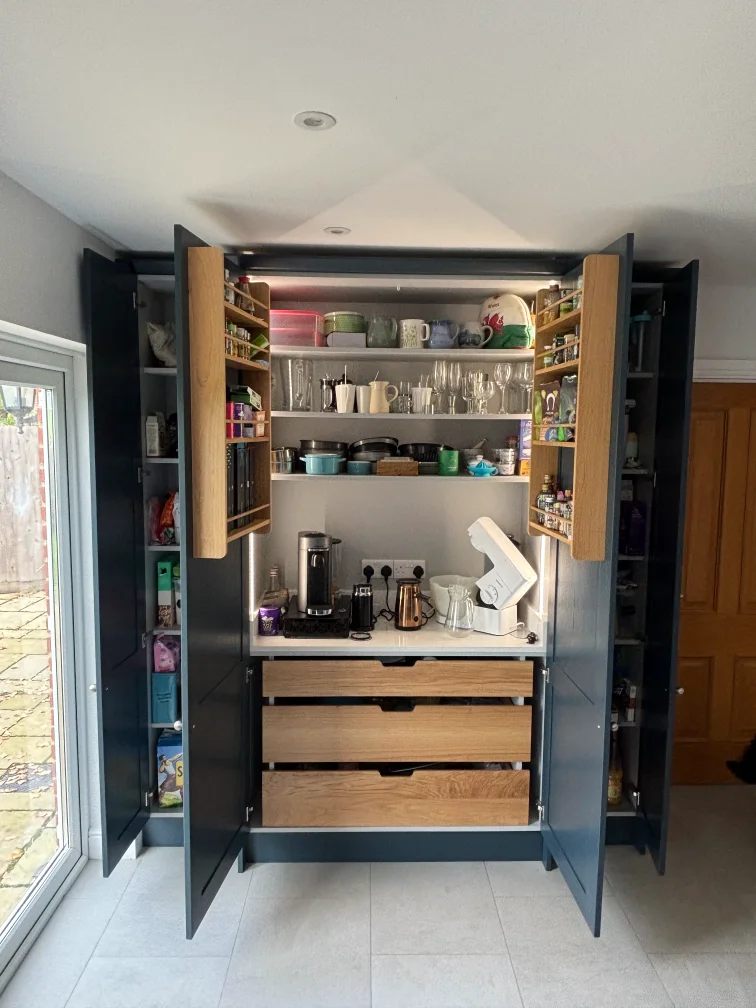 - Internal upgrades – Oak dovetail drawer boxes for strength and longevity, plus oak spice racks inside the pantry for order at a glance