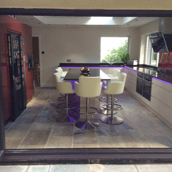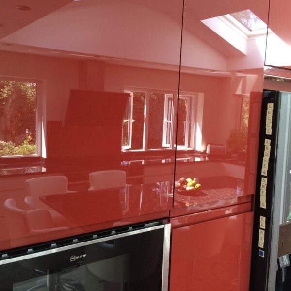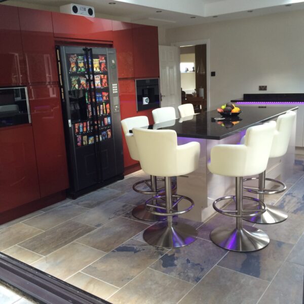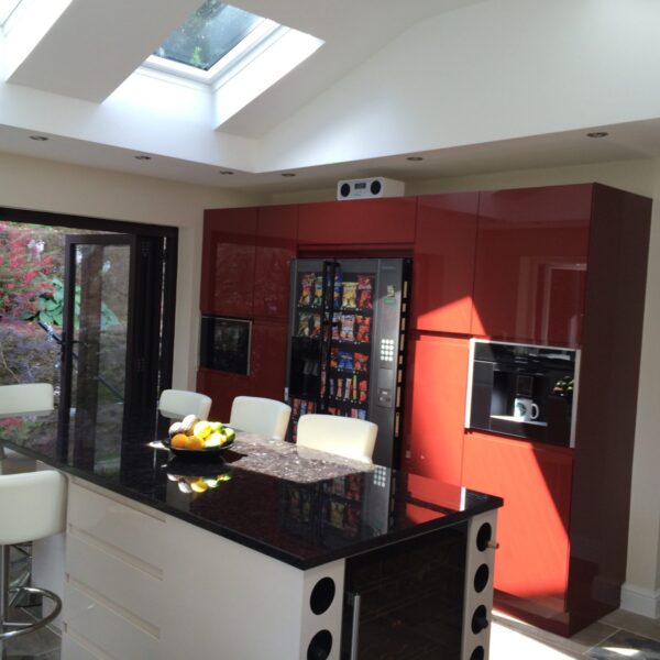 They originally had a kitchen and utility room; which were small rooms with little light. To make the most of their beautiful surroundings they chose to knock the two rooms into one; with a vaulted ceiling with velux windows and bi-folding doors leading to the back garden. The use of Parapan solid acrylic high gloss kitchen doors with their mirror like finish; enhanced the feeling of bringing the outside in. In addition, the sink was positioned to maximise the view. They chose a NEFF slide and hide oven with built in steam functions and a NEFF built in coffee machine. And no they haven’t got a vending machine in their kitchen, it’s a fridge magnet