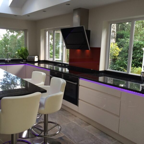 A stunning Parapan Solid Acrylic High Gloss handleless kitchen for a couple in Kinver. They chose doors in maroon and cream white with granite worktops in antique brown. Their house is in a unique location built into the hills with stunning views over Kinver. Therefore, we designed the kitchen to complement their surroundings.