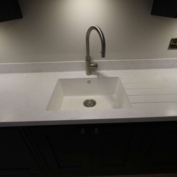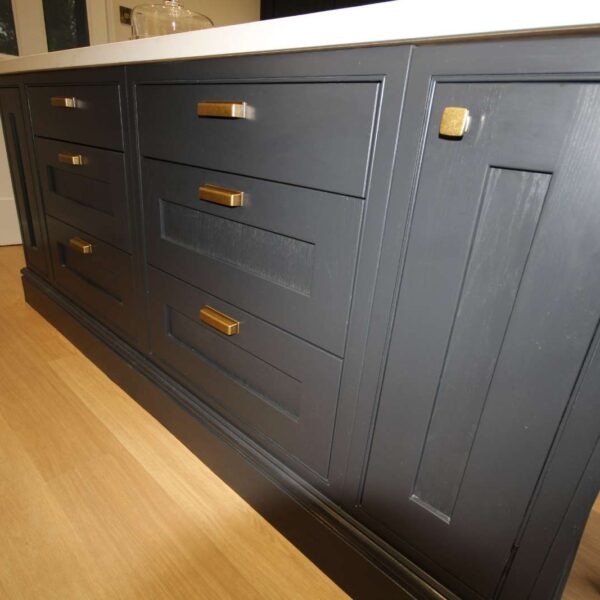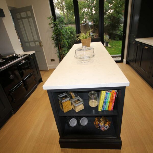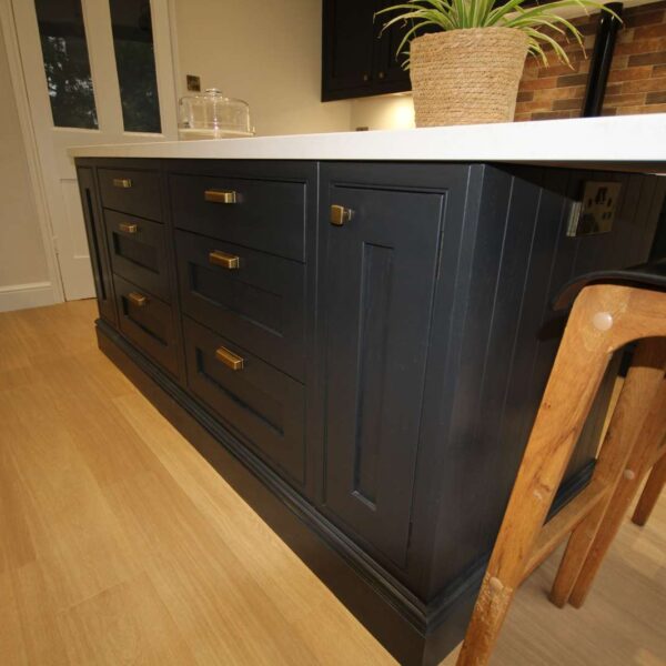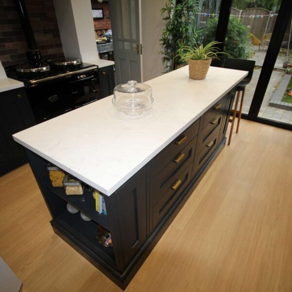 Using our bespoke in-frame kitchen cabinetry we created two distinct work zones; with a 780mm wide bespoke island unit tying the two sides together. The island had an open-end unit to one end, and a breakfast bar to the other end overlooking the garden. Although quite a narrow island, a traditional skirting on the outside of the island gave it a real solid and planted feel.