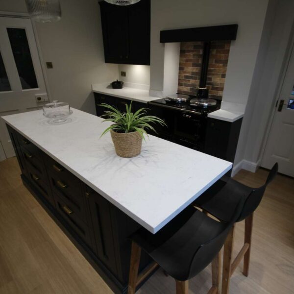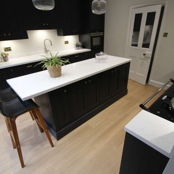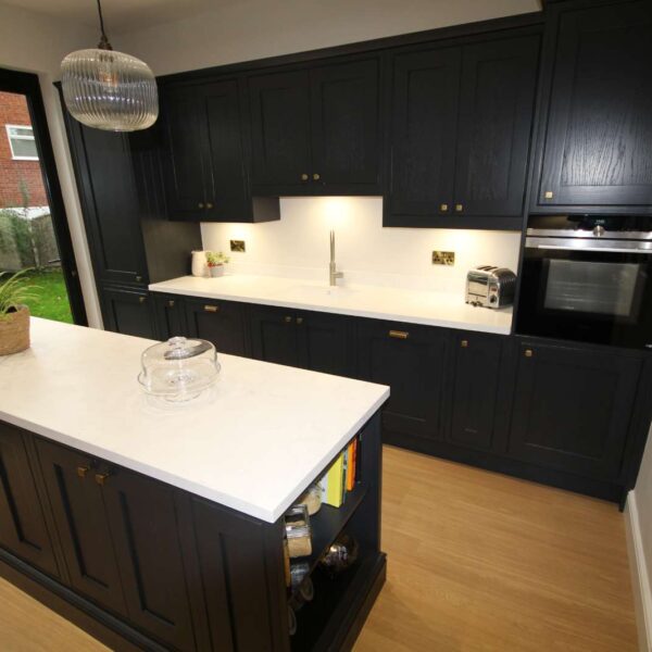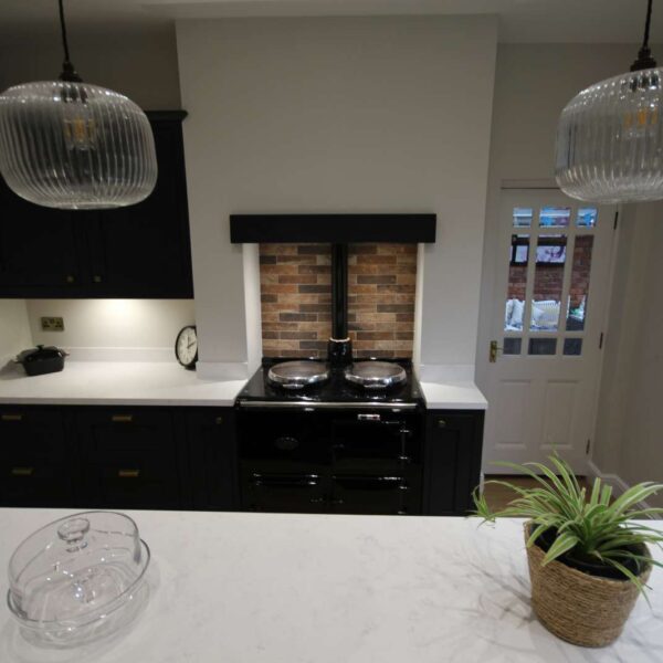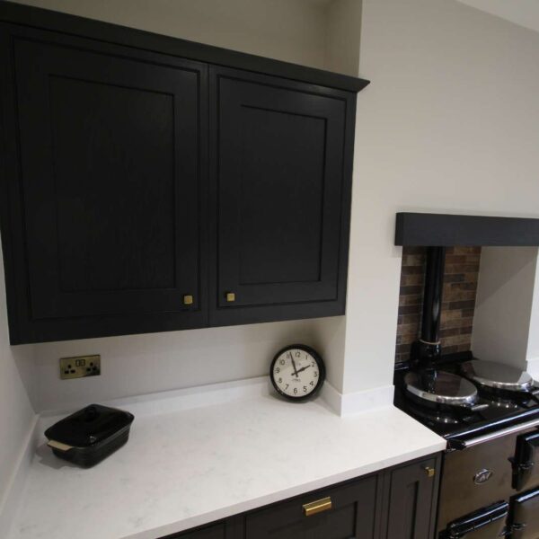 A stunning in-frame kitchen in Farrow and Ball off-black. Our clients lived in a beautiful characterful, traditional property in the Old Quarter area of Stourbridge. They had a good-sized kitchen, with lovely features; such as high ceilings and an aga; but didn’t feel like they were making the best of the space; and were struggling to come up with ideas. Ideally, they wanted more storage and a seating area, but didn’t want it to feel cramped.