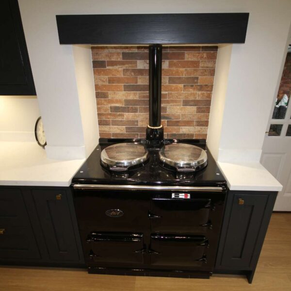 Lots of drawers were included, extra high cabinetry, brick slip style tiles and a bespoke oak mantle painted off-black to match the doors.