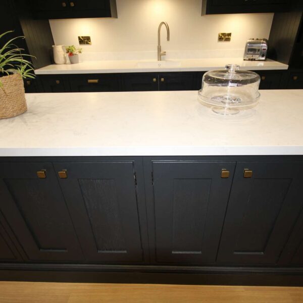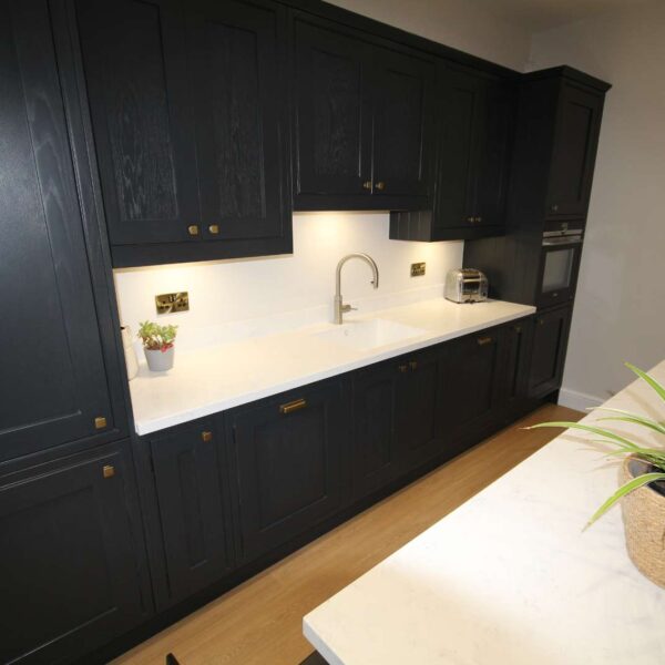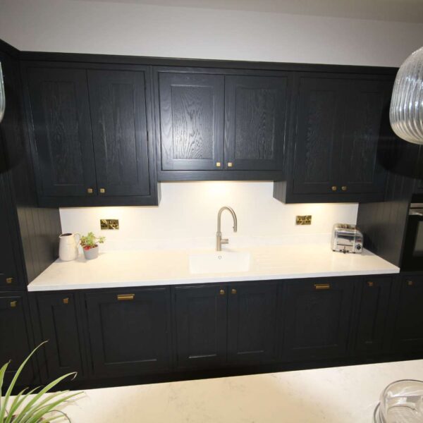 - Shaker In-frame painted ash kitchen in Farrow & Ball off-black, with soft close hinges and fake black butt hinges