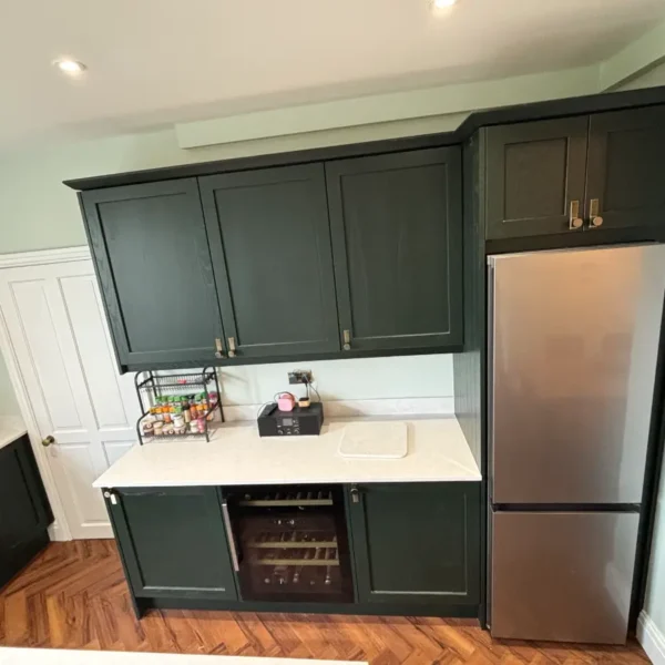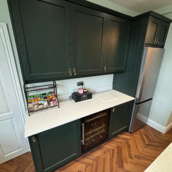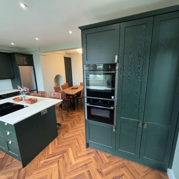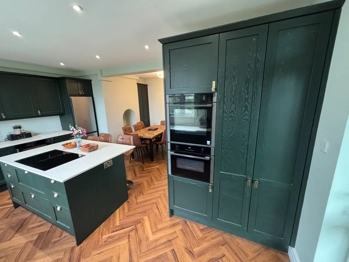 - Bespoke skinny shaker kitchen in a striking Obsidian Green finish