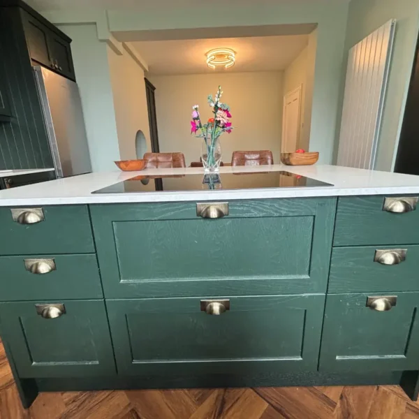 The Obsidian Green cabinetry anchors the room, while the oak interiors and bronze detailing add warmth and character. The island becomes a natural focal point – a place for cooking, gathering, and everyday living.