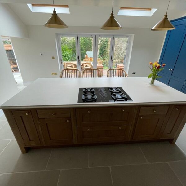 The centerpiece of the new kitchen was a stunning, natural oak island unit, featuring a breakfast bar, an open shelf unit, and a Bora classic venting hob at its core.