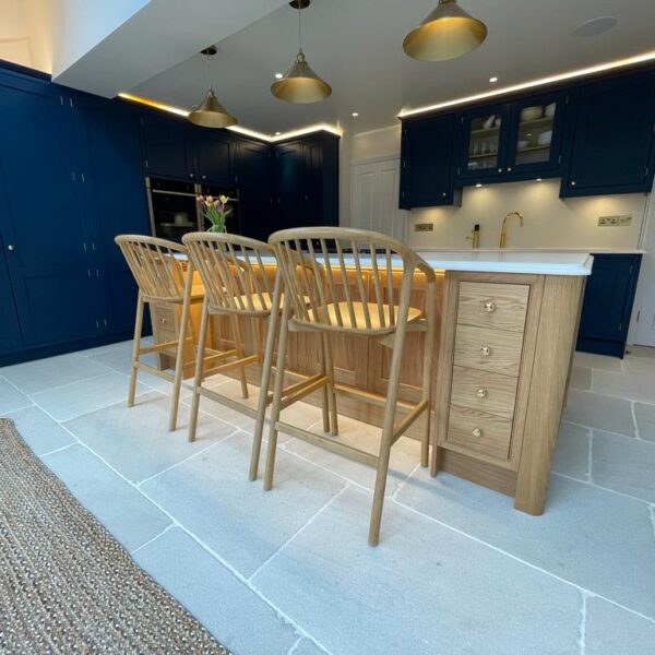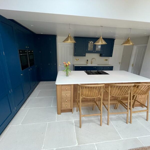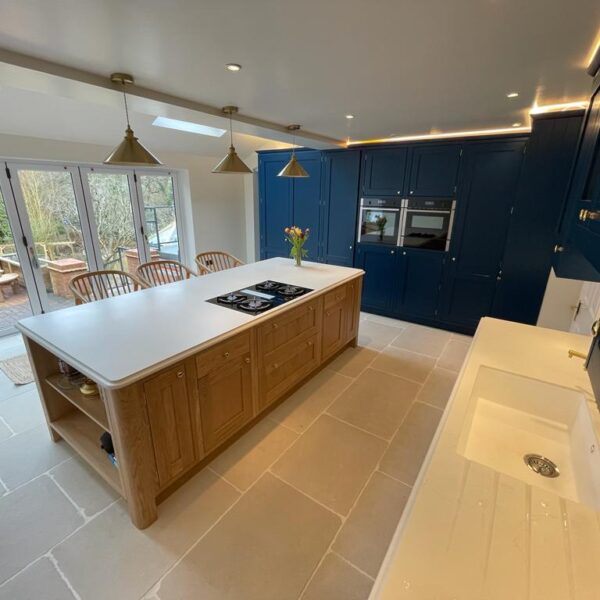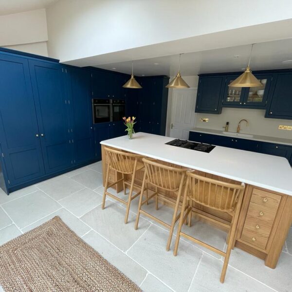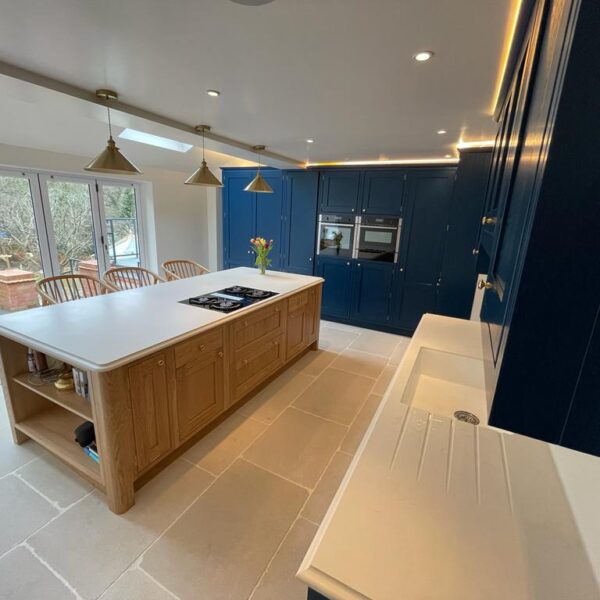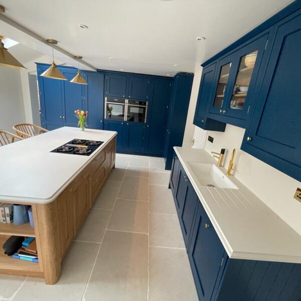 - In-frame kitchen painted in Little Green royal navy with a natural oak island